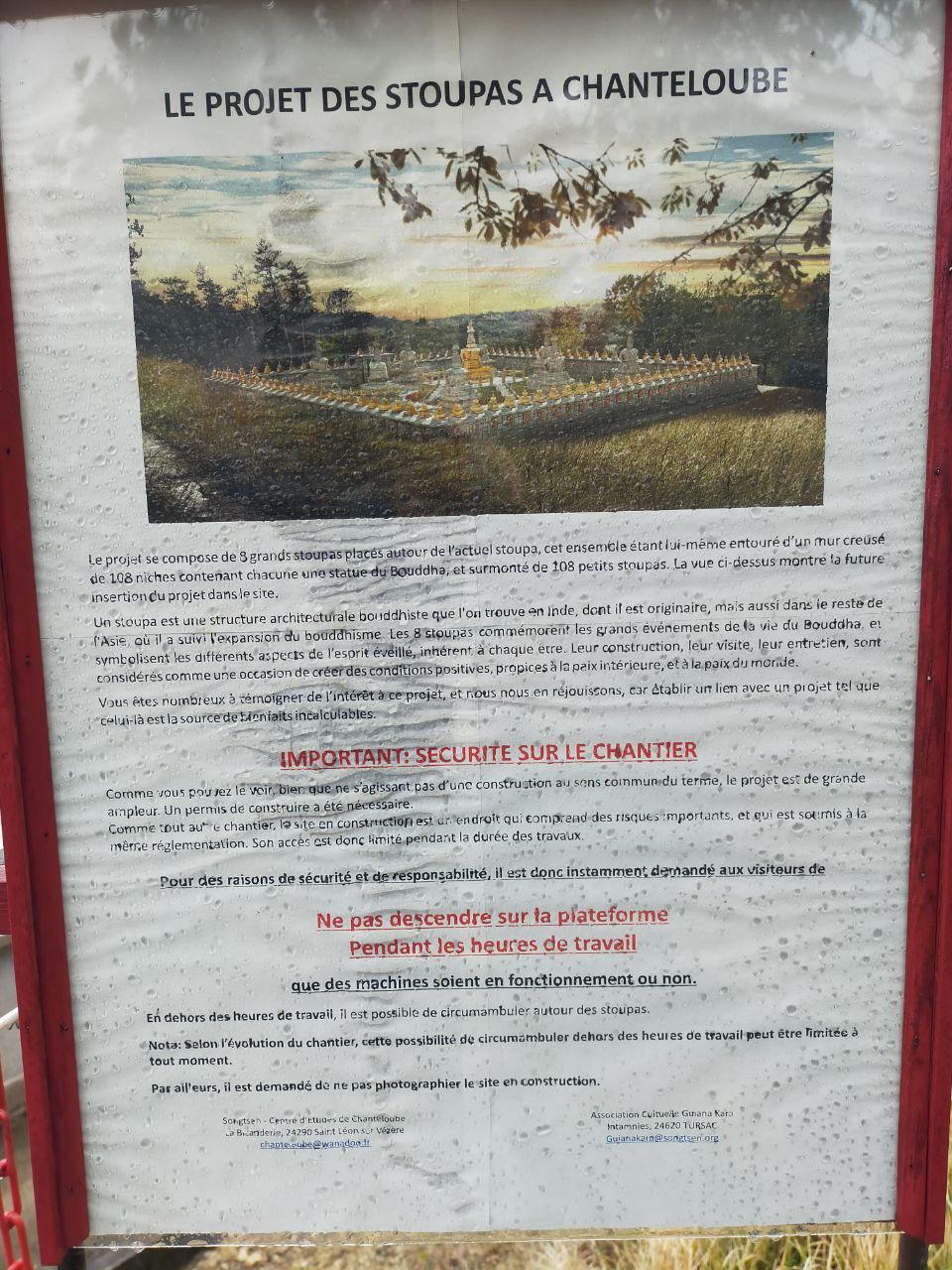 La Dordogne, c’est truffé de Tibétain-e-s ! ça confine même parfois au surréalisme, car c’est pas hyper-fléché*… Imagine : tu descends dans les bois, une petite rando humide et tranquille en suivant le conseil d’un gars qui déchargeait des blocs de marbre portugais d’un improbable 36 tonnes qui t’avait bloqué au milieu d’une petite route de campagne… il fait doux, personne à part le chauffeur de ce petit fenwick qui t’a dépassé et qui a disparu (peut-être dans ce bâtiment caché derrière les bambous, ou dans la cave de cette longère déserte)… et là tout d’un coup, bim : 9 stoupas monumentaux dans une double enceinte de je ne sais pas combien de tonnes !